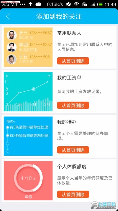 首页展示默认背景图可根据自己喜欢个性化设置。首页可添加自己关注的内容,如待办、休假额度、工资、联系人等;