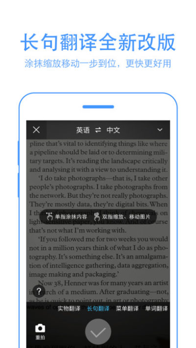 3.拍照翻译全新改版,涂抹缩放移动一步到位;