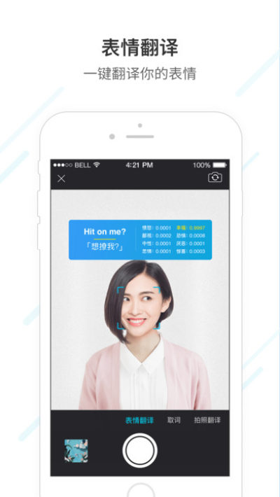 表情翻译——热爱自拍,喜欢搞笑的你怎么会错过这个神奇的功能,拍下你的面部表情,系统会自动分析面部表情元素,生成愤怒、惊讶、快乐等情绪数值,并匹配一个最佳的趣味英文翻译。