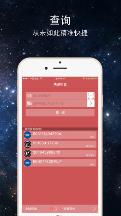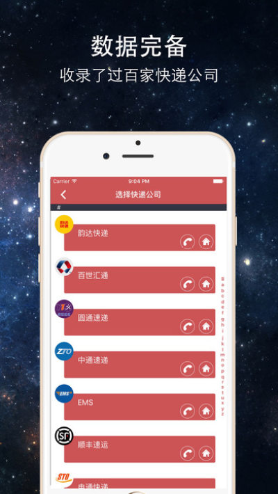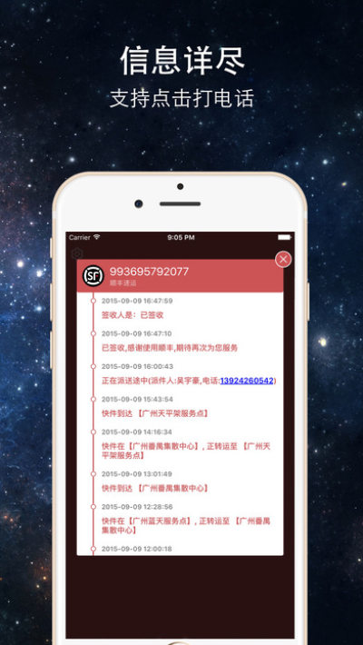 4.大且全的快递公司收录,支持查询超过120家快递公司(包括但不限于 顺丰速运 邮政EMS 跨越速运 圆通快递 申通快递 中通快递 汇通快递 天天快递 宅急送)。