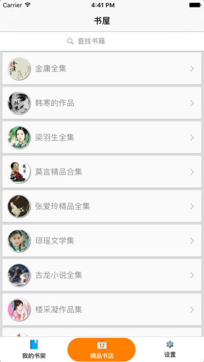 韩寒,张爱玲,琼瑶,春上春树,金庸,张小娴,巴金,莫言。。。各类名家作品随你挑。