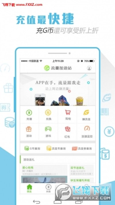 4.充流量 用户可直接充值移动、联通、电信三网流量。充值还能获得免费流量券、实惠!用G币购买流量享打折优惠,划算!