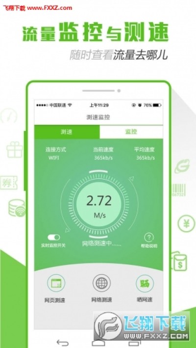 2.网络测速 用户可以随时测试上网/下载速度,并能实时监控网速,且实时监控不耗流量,不影响其他应用使用。