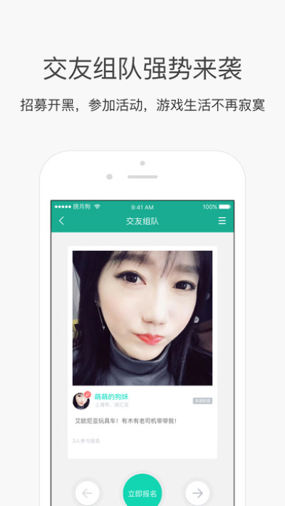 添加个性自拍、发起招募口号,即可用你响亮的大名发起活动,征收兴趣相投的小伙伴,创建属于自己的社团组织。撩妹狂魔?交际大手?后宫千万?捞月狗用交友组队成就你的梦想!