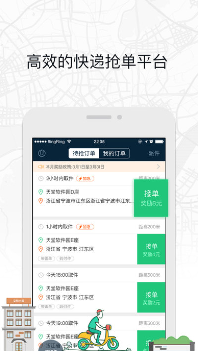 这是艾特小哥小哥平台的快递员专用手机客户端,你可以直接通过它来在线接单,为用户提供各种邮寄服务,同时你在送快递的时候也可以直接通过它来查询客户地址,这对于提高你的工作效率是很有帮助的,欢迎有需要的朋友来这里免费下载使用!