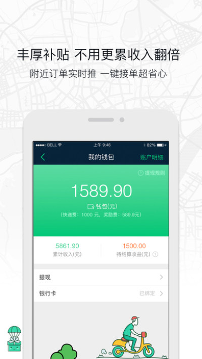 取件快、奖励多;取件多、奖励翻倍。见货收款,自主定价,费用0纠纷。 绑定银行卡,及时提现,安全便捷。