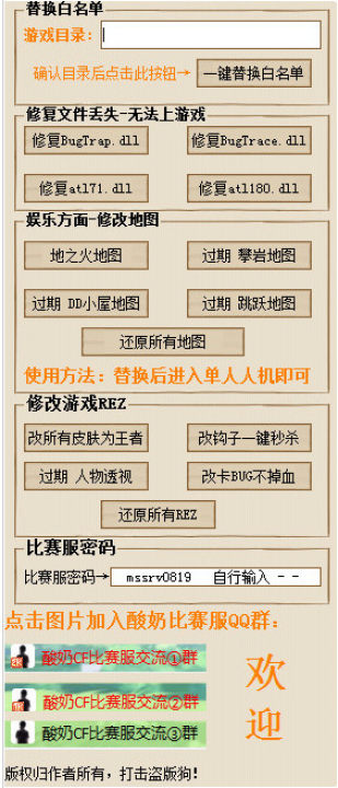 所谓的酸奶CF一键白名单工具其实就是让你通过白名单,直接进入登陆比赛服,并且CF酸奶比赛服一键白名单工具还拥有多种rez辅助,欢迎来下载使用。