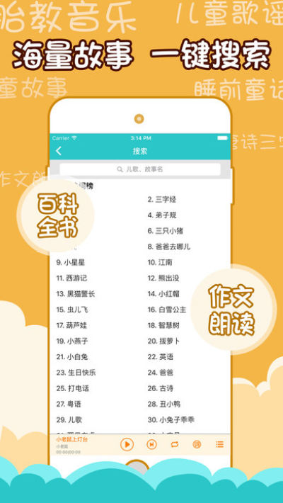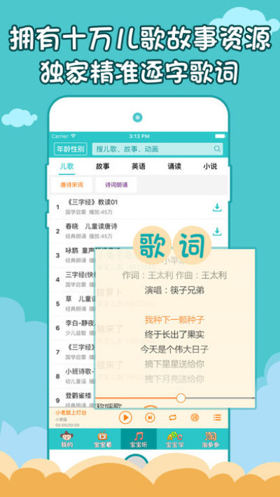 提供妈妈和宝贝最爱的胎教音乐、儿歌童谣、儿童故事、睡前童话、唐诗三字经、作文朗诵、少儿英语、百科全书等有声读物。海量故事,天天更新;