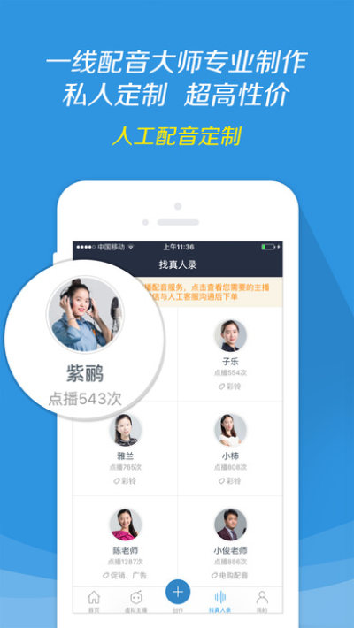 2:真人配音:试听真人样音,选择心仪的配音员,联系客服,发送配音文本,客服会联系配音团队制作并第一时间将配音作品反馈给你。