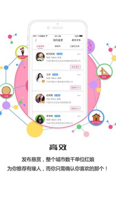 3.高效:发布悬赏,整个城市数千单位红娘为你推荐有缘人,而你只需确认你喜欢的那个!