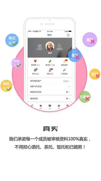 1.真实:每一个成员被审核资料百分百真实,不用担心酒托、茶托、饭托和可恶的已婚男!