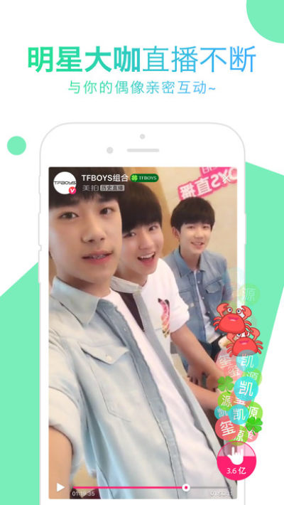 ·TFBOYS 入驻美拍啦!超精彩的王俊凯万人K歌、王源吃秀、易烊千玺才艺秀直播回放等你来看!与超人气少年偶像组合TFBOYS亲密互动接触;