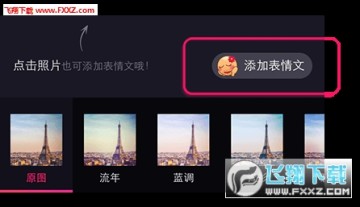 ②在照片编辑页面,点击想要在照片上添加表情文的地方,或点击“添加表情文”按钮,进入表情文添加页面。