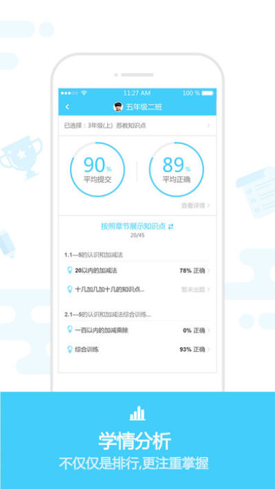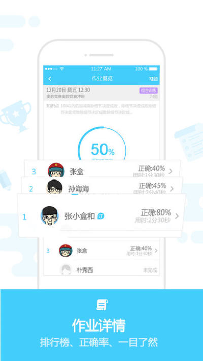 3.多维度(排行榜、正确率)统计作业结果,学情一目了然