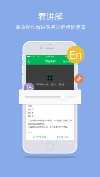 天天扫题不仅改变用户长久以来形成的使用教辅书的习惯,而且巧妙的将其与互联网无缝对接,解决了传统教辅“缺少动态讲解”等问题,将“死书”变成了智能的、动态的“活书”。可以说,传统教辅有的,天天扫题全有;传统教辅没有的,天天扫题也有!