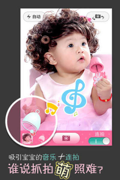 宝贝的萌样老抓拍不下来,怎么办?来点音乐,再用上连拍模式,咔咔咔,选一张最好的开始P图吧。