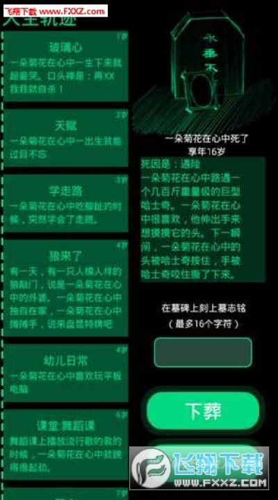 这是一个有关人生的游戏,玩家可以创建自己的角色,在这个逗比的社会中经历一生。死后还可以将自己的坟墓与朋友分享。游戏内事件会根据角色的选择发生改变,一些事件也会随机发生。事件全靠玩家贡献,你也可以将你的想法,提交给作者,写进游戏中。