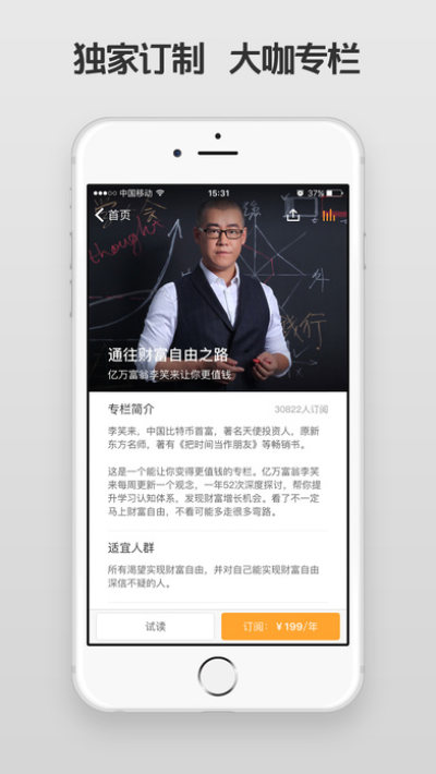 知识大咖罗振宇、李翔、李笑来、刘雪枫、万维钢、王煜全、樊登、和菜头、卓克、王烁、刘润、何帆、吴军、古典、吴伯凡集体入驻,为你量身打造独家专栏。