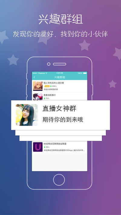 【兴趣群组】光看直播还不够,我们还有社交群组聊天室可以让你与兴趣爱好相同的朋友聊天交友,组织线下单身交友活动。