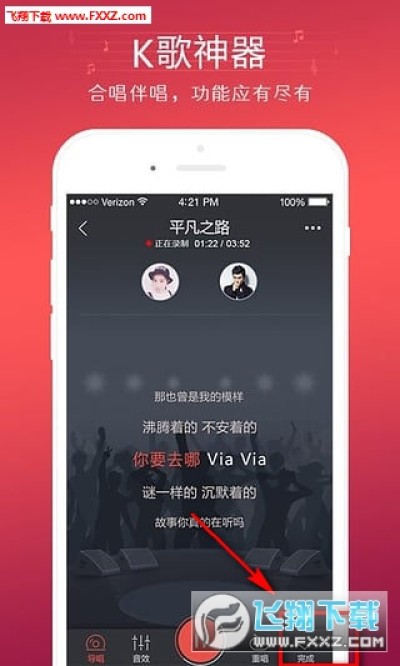 3、进入录制歌曲界面,未唱的部分由你完成,唱完后点击下方的完成按钮,
