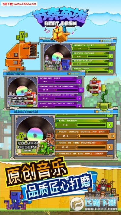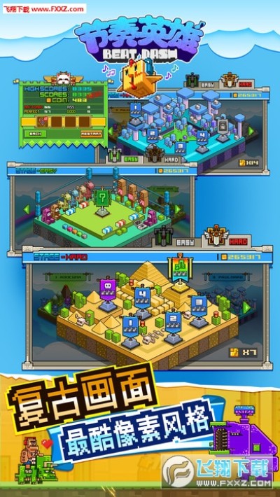 节奏英雄手游官方版是一款音乐节奏和跑酷打斗玩法相结合的跑酷休闲手游,游戏中玩家将会跟随一只可爱的像素方块带着耳机的小鸡来到有着唯美简约的像素充满无数敌人的世界里展开属于你的像素世界探险跑酷之旅,并且在你的探险之旅中你还要收集沿途出现的金币和道具哟!