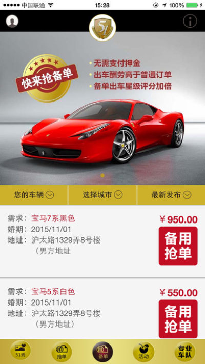 【抢单神器】每天发布大量婚车订单,车主根据档期参与抢单,平台在线派单,流程简单便捷