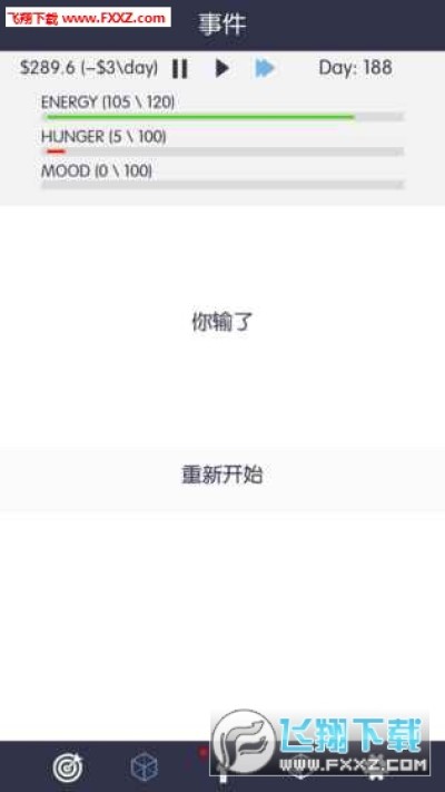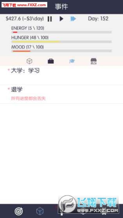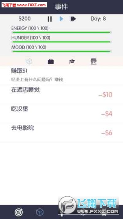 进入游戏界面,明显看到有三个进度条,分别代表人物的三种状态:Energy【行动力】、Hunger【饱食度】和mood【情绪】。行动力代表人物可做出的行为,比如工作或者画画等等;饱食度代表人物的饥饿程度;情绪代表人物的心理情绪;后面的小括号中左边的数字表示现在人物的状态数,右边的数字表示人物的状态数最大值。左上角代表人物所拥有的金钱数,中间的暂停键可以暂停游戏,播放键代表正常速度运行游戏,快进键代表加速运行游戏,右上角代表人物进行时间。
