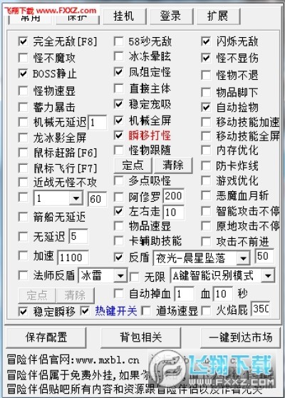 完全无敌+怪物变笨+2点稳定吸怪(请选择小型地图可吸全/大地图不可)+自动加血+自动加蓝+物品过滤+自动登录+智能攻击不停或者原地攻击不停+挂机按键