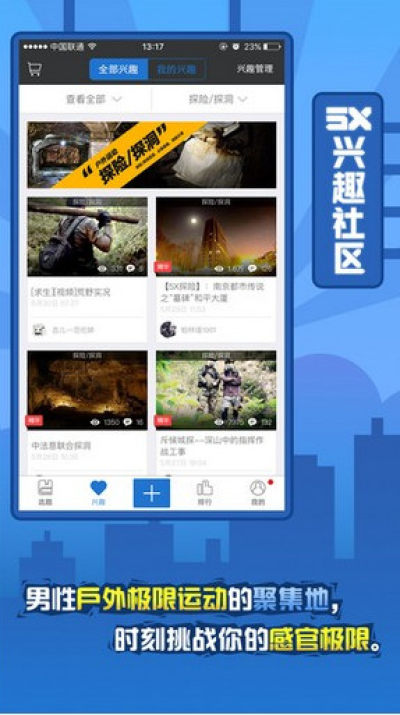 5X兴趣社区,集合了球类、健身类、水上运动类、冰雪运动类、极限运动类、户外运动类,空中飞行类、遥控模型类、数码科技类、军事武器类、时尚生活类、汽车摩托车类等110多个兴趣。如果你擅长某个兴趣又没处炫耀?来这里!如果你常用的社交软件已经刷烂了,不知如何打发无聊时间,来这里!在职员工丰富的互联网论坛运营经验,会让所有优质的内容得到最合理的展示。