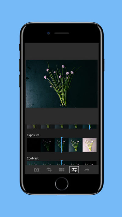 要创建你的专属滤镜,只需要点击下方右边第二个图标,你就可进入一个参数的微调界面。在这里,你可以调节曝光度、饱合度、对比度、阴影等多达 11 项细节参数,并且,下面的图片预览会根据你当前的调节,实时更新全局的预览效果。