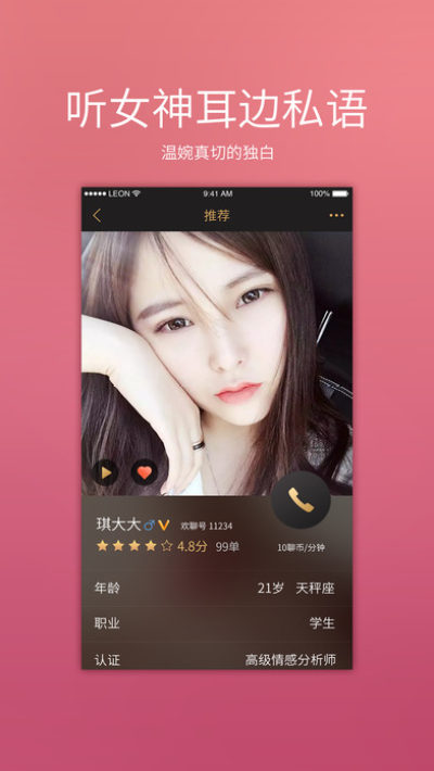 欢聊是免费一对一私密语音社交APP,您可以寻找一位谈资丰富、声音甜美的美女语音聊天,这里有萌妹、熟女、暖男,你可以选择一位萝莉音、御姐音、少女音、大叔音、青受音,与他交流情感、倾述心事、家长里短。让您享受每一段真实的交流!听你诉说心事,陪你谈天说地。