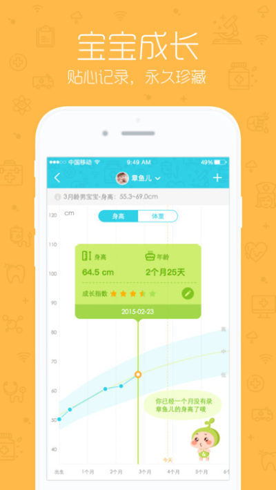 4.成长记录:记录评估宝宝生长发育情况,科学监测宝宝的成长曲线。