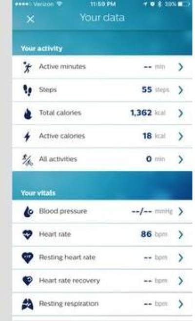 在睡眠追踪的功能上,也有同样的标准,所有有用的指标都可以看到,包括睡眠时间、睡眠效率、深浅睡眠过渡阶段等,并且能进行每月和每周的图表显示。而在睡眠和清醒的不同状态下,会用不同的颜色标记出来。最后,这款App还提供了一切有趣的功能来帮助我们完成目标。比如我们可以对目标、提醒和个性化数据贴上标签,并且共享给其它人。在这方面,飞利浦设计得非常不错,要比三星S Health这样全是文字的界面更吸引人。