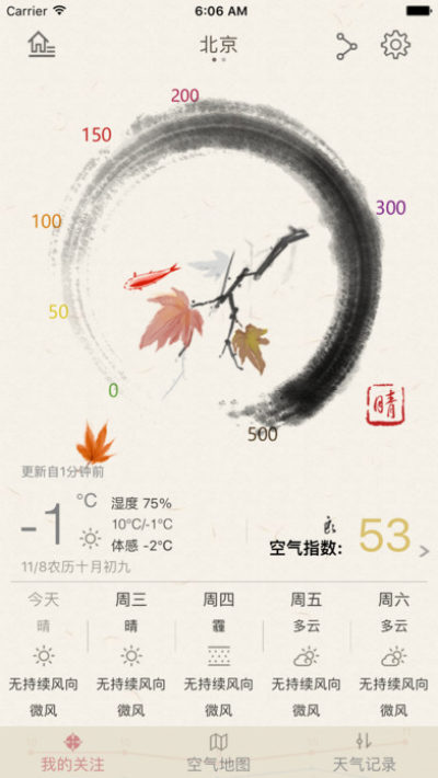 与《最美天气》不同的是《小鱼天气》采用古典水墨风格动态界面,生动形象的为用户展示了天气的信息,小鱼指示的位置是当前的空气指数,空气质量越差,水墨的颜色越重。而且该款应用还提供了“空气地图”和“天气记录”功能。