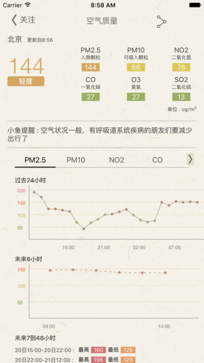4.可自动追踪您的地理位置变化,把握您的每日行程,温馨提示当天PM2.5吸入量;