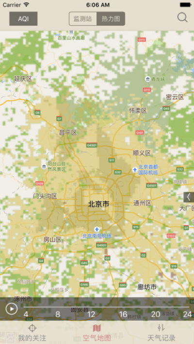 在“空气地图”中,我们可以查看周围地区的空气质量及热力图,从下面的截图可以看到,今天北京的空气基本上是中度污染。