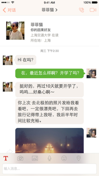 支持发送语音短信、视频、图片(包括表情)和文字,支持多人群聊、随时创建群聊。