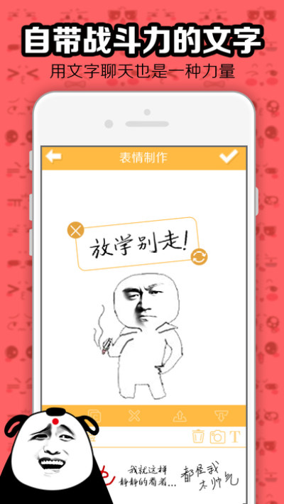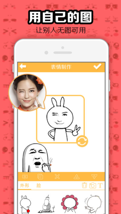 涂鸦表情不仅仅是一款简单的表情包应用。它不但包含了大量在互联网上流行的各种表情图片。最重要的是,你还可以通过组合自己喜欢的表情外形图片和面部照片,来创建出属于自己的表情。如果你愿意,你甚至可以使用相机拍张照片,生成面部图片,来组合出表情。