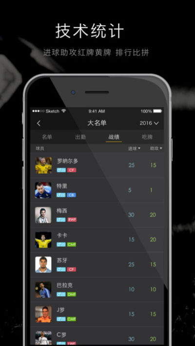 队员报名、签到、出勤统计以及比赛结果纪录等。为足球队管理提供便利。
