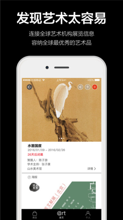 您可以添加观展计划,查看展览地理位置以及收藏作品信息并通过社交网络与朋友分享。即刻下载,艺术与你近在咫尺!