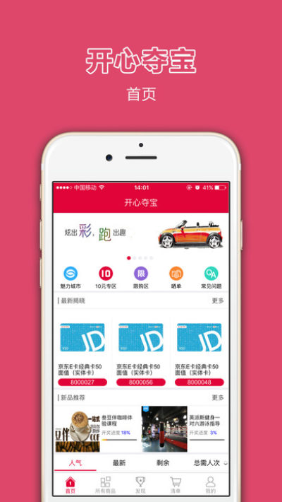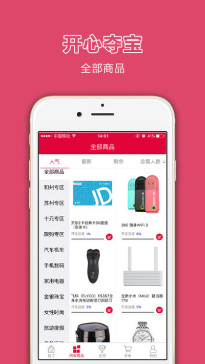 在开心夺宝,你可以参与丰富的众筹活动,实现自己一元获得热门商品的愿望!