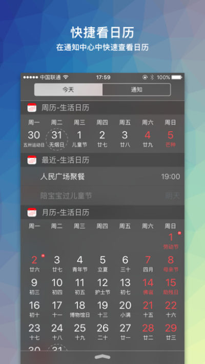 精致功能:200年专业万年历黄历、阴历农历、提醒记事、节假天气、24节气…