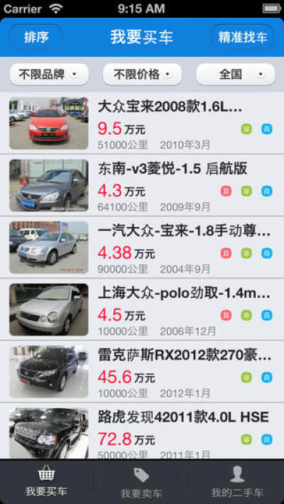 找车:可以根据车型、价格、车龄、里程等条件查找感兴趣的车源