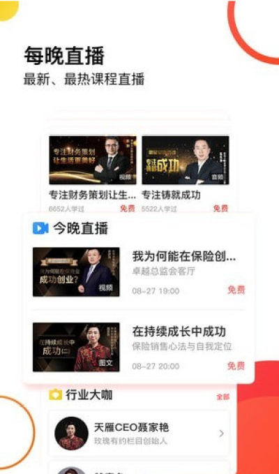 天雁商学院app主要能提供保险从业人员的开放式的终身学习平台,是保险文化传媒集团旗下的一个学习客户端,天雁商学院app为广大保险从业人员解决销售、增员、管理以及人生成长中的各种难题