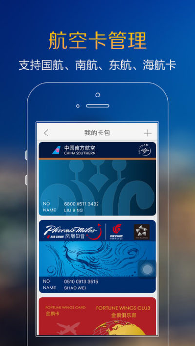 覆盖国内多家航空公司常旅客计划管理体系,一账户绑定多张航空公司会员卡。