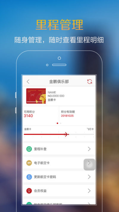 首家推出一键拍照补登功能,拍下登机牌照片即可在线提交补登申请,方便快捷,实现里程0遗漏!随身查看个人里程账户,及时查询里程到账情况。更可尊享里程奖励、兑换机票和各种礼品,尽享特权服务。