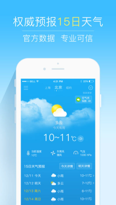 1、独家预报7天、10天、15天天气预报,数据来自官方权威机构,打造中国最精准天气预报。