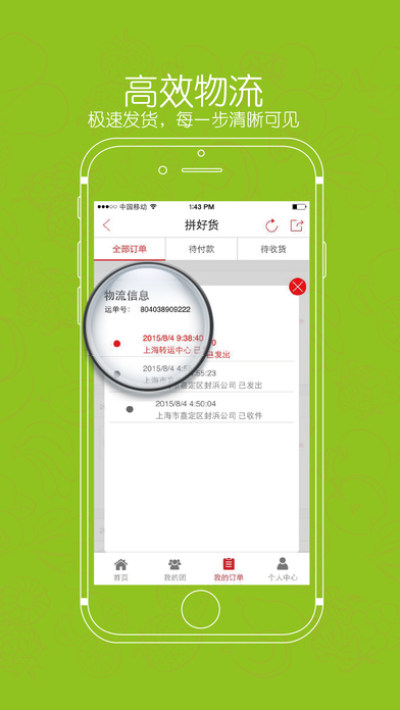 -高效物流:拼好货将新鲜水果,配送到家。拼好货商城有自己的电商快递系统和高效物流体系,极速发货,每一步清晰可见。配送员将您拼团的鲜果,从配送中心配送到位,让您在家就能品尝美味鲜果。