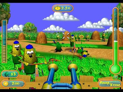 《 植物大战农夫》一款射击类的小游戏,从名字看还以为是植物大战僵尸,其实跟那没关系,有点像抢滩登陆战,不过这个射杀的是植物,比如鸭梨,南瓜,玉米以及各种各样的植物。游戏剧情:由于农夫使用了药水想拔苗助长,导致植物开始变异,并有了思想,同时开始攻击人类,可以说是变成了植物僵尸。玩家以第一人称操纵农夫在据点进行射击,游戏过程中会不时出现金币,药水,闹钟等道具,一局游戏结束,用金币还可购买手雷或者威力更大的机枪,以便更好的阻止植物靠近,当植物全部围拢过来敲打着栅栏的时候,这种感觉就像僵尸围城。