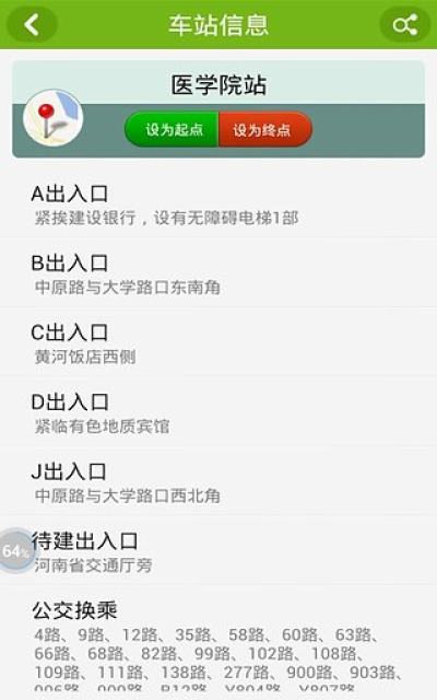 郑州地铁是基于郑州本地的一个免费地铁查询手机软件!支持地铁信息查询,以及周边搜索,让你轻松享受郑州地铁生活。功能更是贴心,不仅能展示最优的出行方案,还可一键导航至终点,路程中如何转乘公交,如何步行最少,至地铁站后,选择哪个进站口,到终点选择哪个出站口,都能清楚的展现,且此出行方案还能进行转发分享,更好的服务首次乘车的市民。